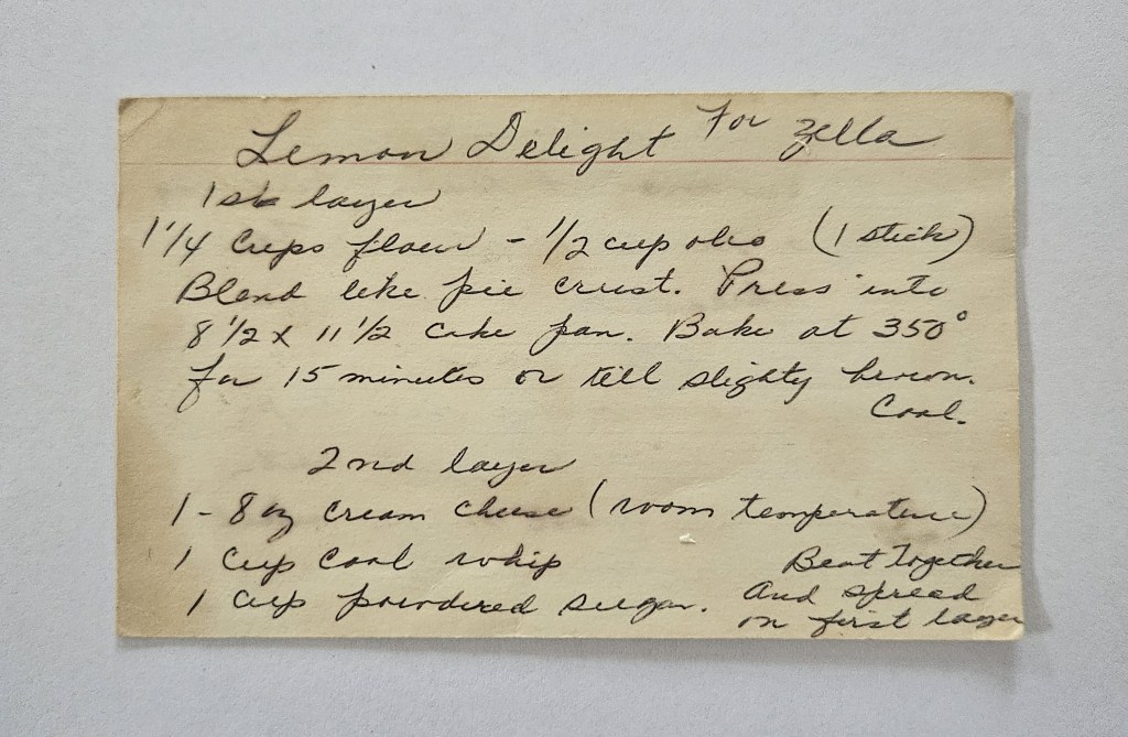 Zella was my great grandmother. According to my mother, she was sarcastic, witty, and bossy. A lively, energetic person. She lived from 1919 to 2003, and I never really knew her. I wish I could have though. Arline Mitchell was a friend of hers who passed the recipe along.